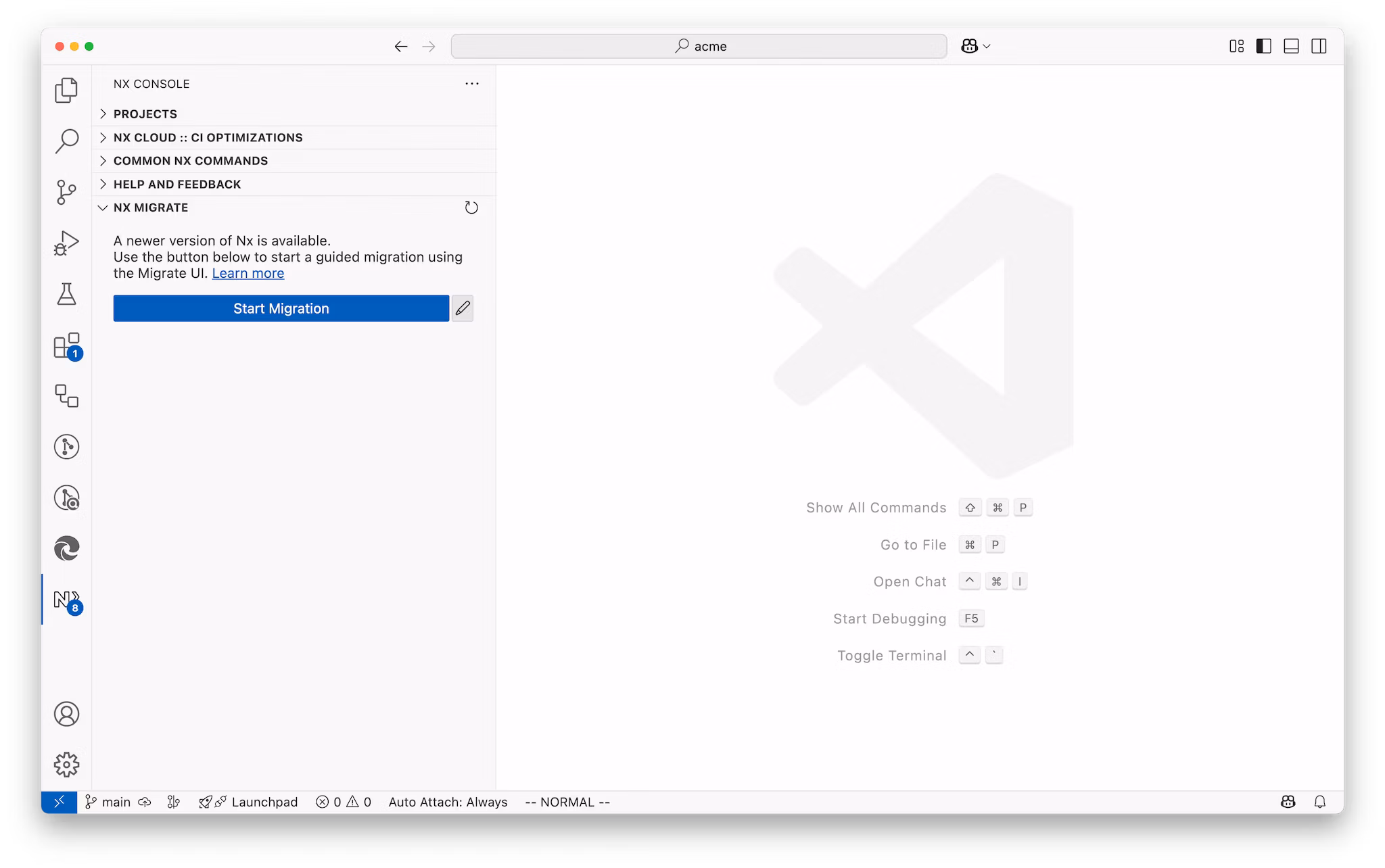 When an update to Nx is available, a badge will appear on the Nx Console icon in your Activity Bar. Bring up the Nx Console view (Hint: type in > Show Nx Console in the Command Palette), and you'll see a Nx Migrate section in the sidebar. Clicking Start Migration starts the migration process.